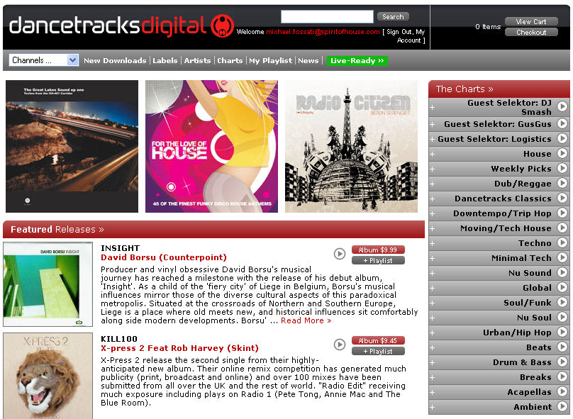 The menu now includes a drop down list that gives you direct access to all the channels. You also get direct access to a list of all featured labels and artists as well as current charts and current newlsetter. Most interesting are the new added features My Playlist and Live-Ready >> - before we look at these, lets see what the chart section on the right has to offer.